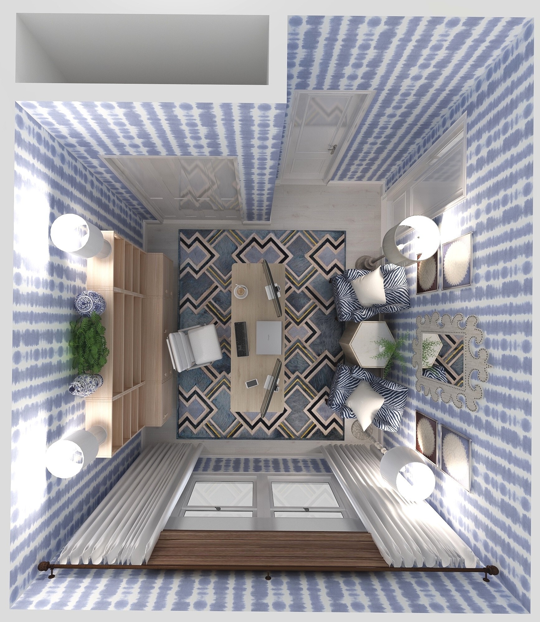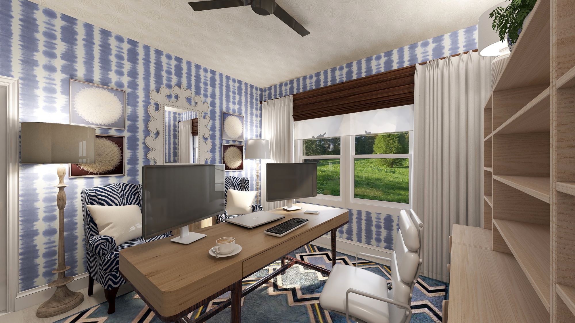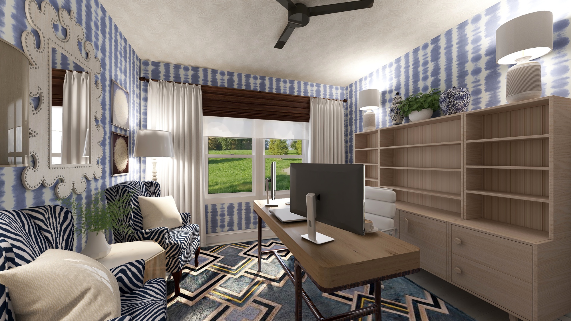 This home office is maximized with storage, seating and work surface. The color story is soothing and the textiles add softness and serves acoustics. The layered window treatments allow for best possible lighting and privacy control.